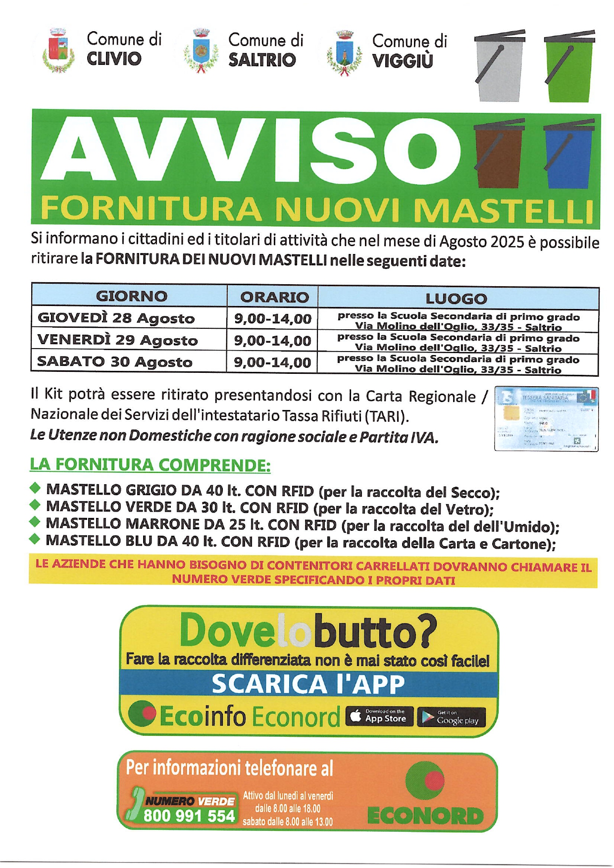 Si informano i cittadini ed i titolari di attività che non hanno provveduto al ritiro dei NUOVI MASTELLI nel mese di luglio 2025 che è possibile ritirare i nuovi mastelli NEI GIORNI 28, 29 e 30 AGOSTO dalle ore 9.00 alle ore 14.00 presso la Scuola Secondaria di Saltrio sita in Via Molino dell'Oglio N° 33-35. Vedasi locandina allegata.